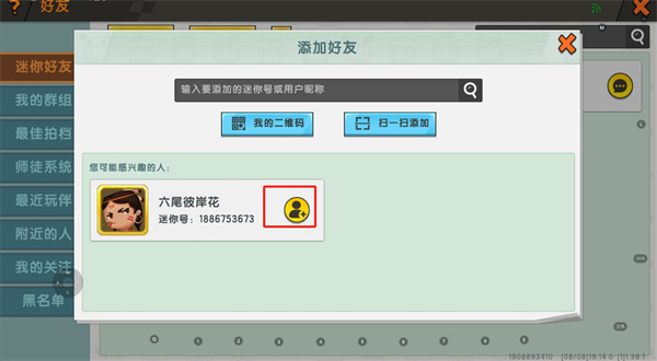 4、搜索到好友之后,我们就可以直接点击对方名称右边的【添加图标】完成添加好友的操作。