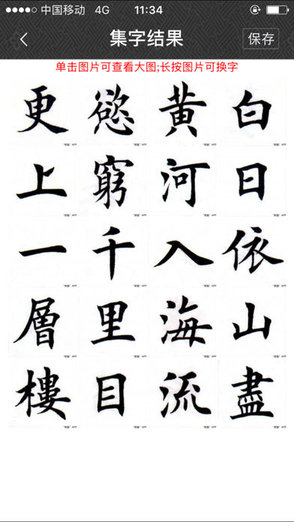 碑帖单字。把经典书法碑帖截成单字图片,配上米字格,每页展示一张,更方便、更准确的在手机端读帖、临帖。