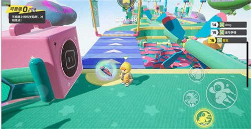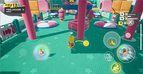 1.首先下载安装好元梦之星游戏后,点击进入游戏,游戏有很多不同的地图,大家可以选择喜欢的地图进入,屏幕中左边的轮盘用来控制移动,右边分别是道具使用、跳跃、飞扑加速技能;
