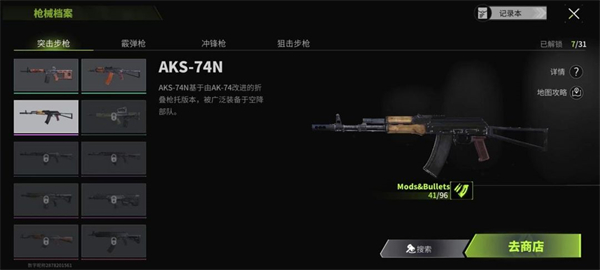 枪械在游戏中主要通过商城购买;对局内击杀夺取别人武器;武器箱以及空投中获得。这里非常推荐一把前期可以成为平民战神的AKS-74N,属性够看而且配件丰富,和人钢枪绝不会轻易落入下风。而且也因为持有率高,很容易在敌人手中顺便缴获一把存在仓库里,即使没了也不心疼。