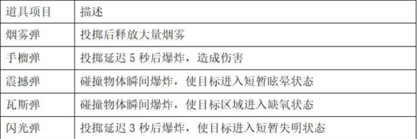 大家虽然可以在商店中购买道具,但对萌新来说太“奢侈”了。所以还是在地图中的投掷物品箱和敌人手中缴获比较好。这里最推荐的是紫色震撼弹,可以让敌人被控几秒,不论是进攻还是跑路都非常好用。至于其他投掷类道具,各位萤火虫可以参照下面的表格,按喜好搭配。