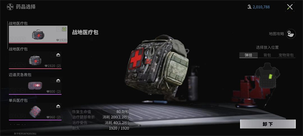 当然,道具的必选项还有医药包,如果你喜欢刚枪,那么建议带上战地医疗包,其回复量足够支撑各位持续多场战斗。在对局中使用医疗包之前,一定要注意确认周围环境足够安全后,躲在掩体后治疗,否则治疗期间既不能移动也不能开枪,被人发现就是活靶子非常危险。