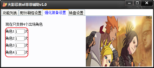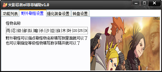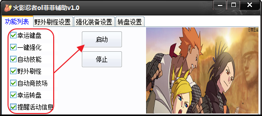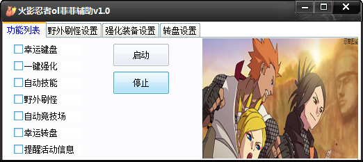 火影忍者ol菲菲辅助是一款纯按键辅助工具,专为游戏《火影忍者ol》打造,辅助不会修改游戏的任何数据,安全性更强大。软件功能强大,为玩家提供自动喊话、自动强化、自动野外刷怪、自动升阶等功能,用来挂机和做活动非常不错。赶快下载体验吧!