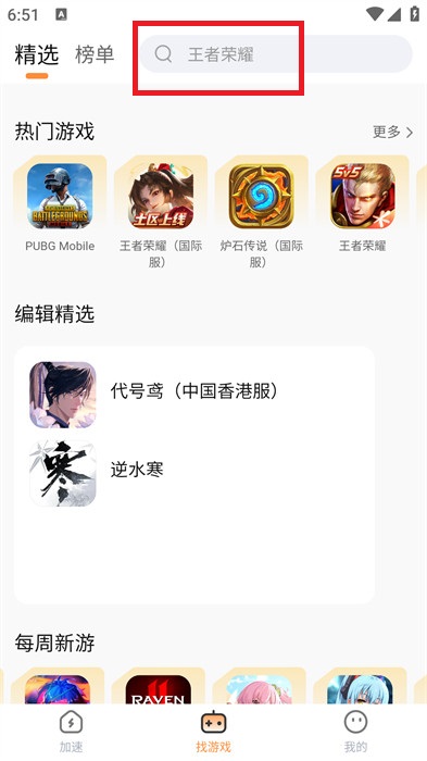 3、登录注册完成之后就可以正常使用,可以点击上方输入框,【搜索】想要加速的游戏;