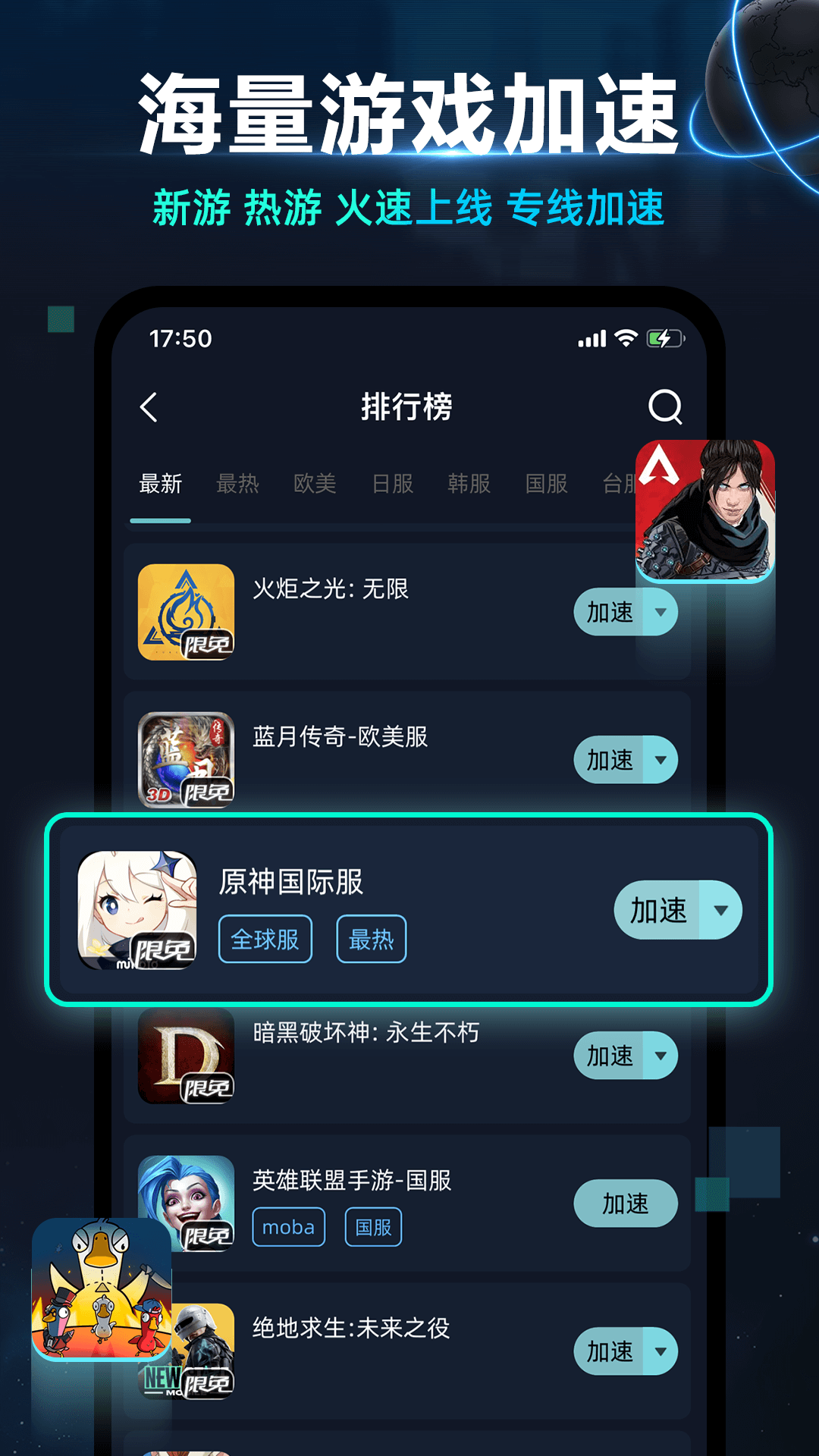 6、支持多款热门的手游进行国际加速服务,与更多国家的玩家进行竞技。