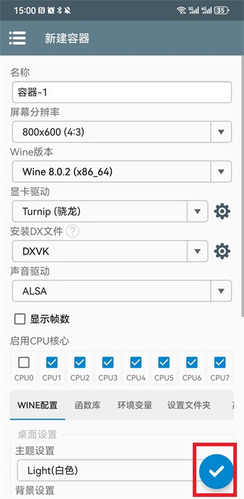 2、紧接着在弹出的新建容器界面,直接点击右下角的【对号】完成容器的创建;