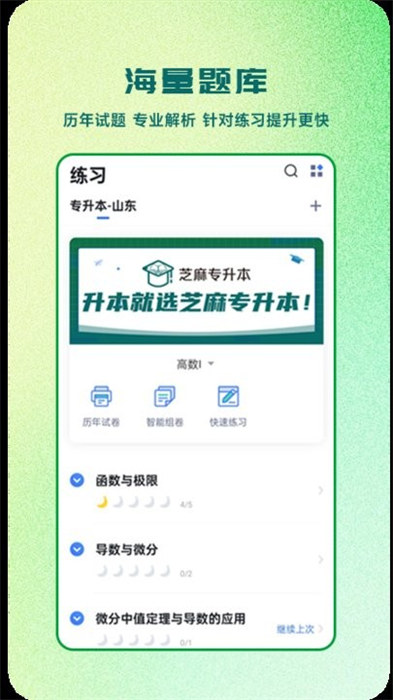 芝麻专升本是一款可以学习到更多知识内容的应用,用户们可以在软件里面进行模拟的考试和知识内容的学习,学习的资源内容会及时的进行更新的操作,保障用户们可以快速的跟上最新的知识点内容,而且还有十分详细的视频讲解知识点的内容,让用户们可以更加清晰的了解到知识点的内容。