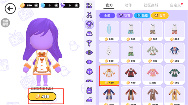 2、需要选中场景内自己喜欢的服饰,选中后,点击屏幕左下方的金币按钮即可实现服饰的购买