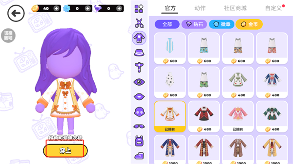 3、当场景内出现“穿上”按钮时,即意味着服饰已经被购买成功,玩家将可以自由的进行穿戴;