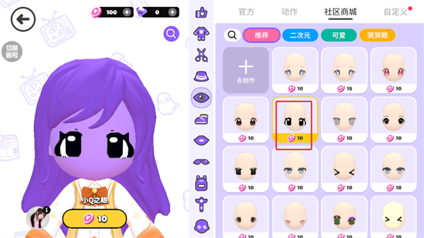 4、能够通过不同五官按钮的选择来进行五官的自定义,如给自己的角色选择一双大眼睛等。