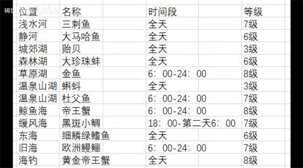 4、在彩虹天时,玩家还将可以在不同的区域钓到一些品质优良且稀缺的鱼类,以下是不同鱼类出现的位置和时间段图标。