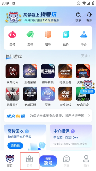 1、第一步,进入软件后将会看到有关游戏交易的所有功能,我们选择下方的【买号】栏目;