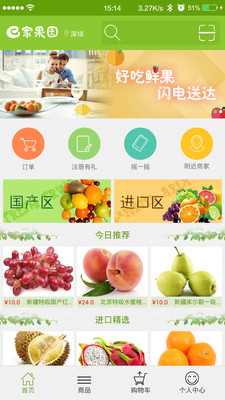 1.鲜果品闪电送达。吃鲜果得等多久?明后天?OUT!选择“e家果园”,想吃就吃,我们纵容你的任性。线上下单,30分钟即享新鲜水果、鲜果切、鲜果汁,让你成为朋友圈里拉仇恨的赢家。
