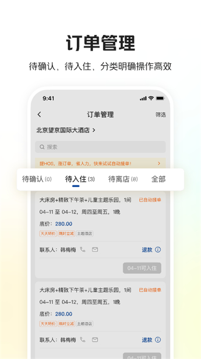 进入订单页,核对房型、入住时间,有房点"接受",没房点"拒绝"并及时关房;