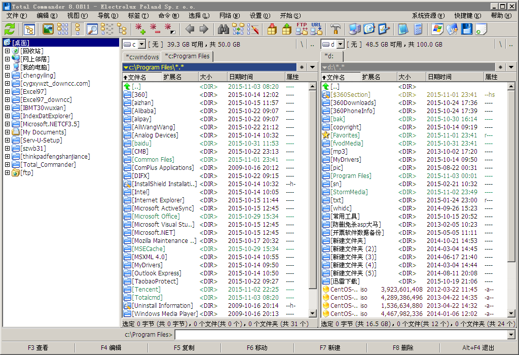 Total Commander是一款功能强大的全能文件管理器(简称 TC)。支持随意自定义的菜单、工具栏、快捷键,给您最大的自由,打造个性 TC。一般的文件操作,如搜索、复制、移动、改名、删除等功能应有尽有,更有文件内容比较、同步文件夹、批量重命名文件、分割合并文件、创建/检查文件校验 (MD5/SFV) 等实用功能。内置 ZIP/TAR/GZ/TGZ 格式的压缩/解压功能,ZIP 格式还支持创建加密及自解包功能。此外,不仅可以直接打开(解开) ARJ/CAB/RAR/LZH/ACE/UC2 等压缩包,配合插件或相应的压缩程序,更可创建这些格式的压缩包,就像创建和打开文件夹一样简单。而搜索功能,无论是文件还是内容,同样支持在这些压缩包中进行。