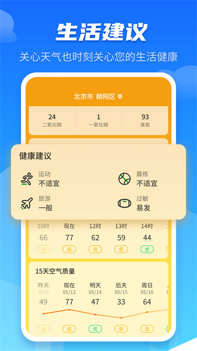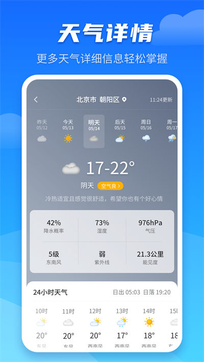 国内一款比较准确预测天气情况的安卓手机工具,它提供了最多一个星期的天气预测,还提供了时下最受大家关注的空气质量问题,实时为大家提供每个城市的空气质量检测,给大家做好预备工作的准备,为大家的提供最适合的出行计划!