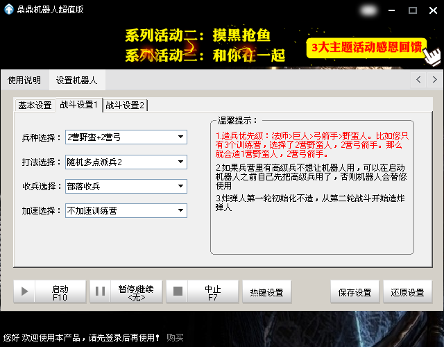 2.如果兵营里有高级兵不想让机器人用,可以在启动机器人之前自己先把高级兵用了,否则机器人会替您使用