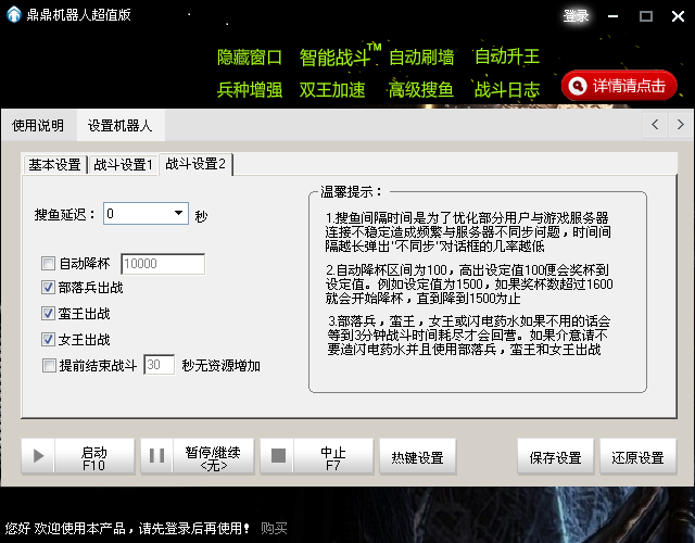 5.功能变更不必中止和重新启动机器人,直接更改就可以。但是机器人要完成当前操作后,接下来再按照更改后的条件进行操作。如果所有功能都关闭,机器人会保持游戏在线