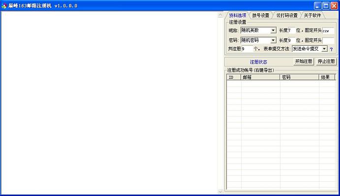 巅峰163邮箱注册机是一款专门用于批量注册网易163邮箱的工具。软件完全免费,可以快速批量注册163邮箱,还可以对面密码和昵称进行设置,非常的实用。赶快下载体验吧!
