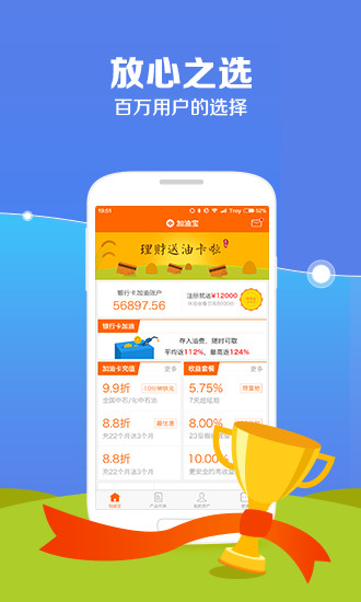 江泰金融加油宝是一款主打汽车加油打折+资金增值的“二合一”产品APP,“加油卡充值打折”、“银行卡加油9折”是目前加油宝主打的两大加油优惠产品。