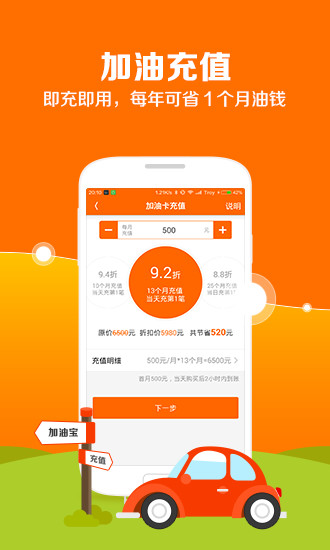 支持对全国中石化/中石油加油IC卡在线直充,按照25个月、13个月、10个月、7个月、3个月、即时充值套餐一次性付款购买分别享受8.8—9.9折,然后每个月自动返还到加油卡