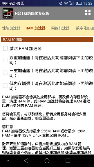 n合1系统优化专业汉化版是一款多功能的手机优化工具。软件功能强大,内置性能加速器、RAM加速器、网络加速器、数字化加速器和省电专家五大工具,帮助优化手机的各项指标。赶快下载体验吧!