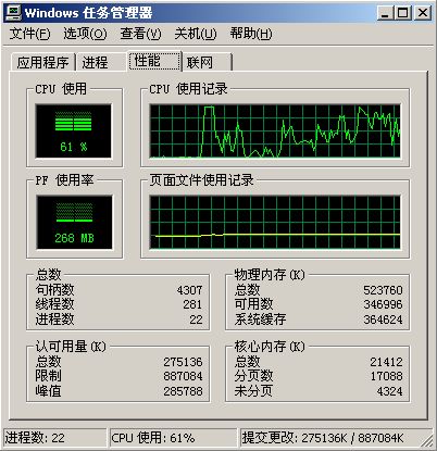 瑞星作为杀毒软件的代表,当然也不可或缺的进行测试。经过瑞星杀毒软件在进行病毒监控时,CPU和内存的使用率分别是5%和239M。可以看出瑞星杀毒软件,是CPU使用率低,但是内存的使用率比较高。当我们通过瑞星杀毒软件进行病毒扫描,发现其CPU的使用率和前两款一样,在升高到100%后降低到61%左右的样子。同时内存的使用率升高到268M,这个时候则出现了CPU使用率高,但是内存使用率基本维持的情况。