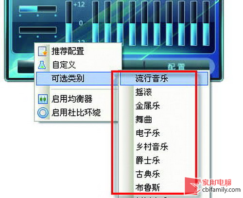 开始均衡器之后,均衡器的值(总体增益值、各个频段的增益)都是默认在零的位置,还起不到太多作用。我们可以选择“配置”按钮里面的各种预设的均衡值,根据你当前的音乐类型进行选择。