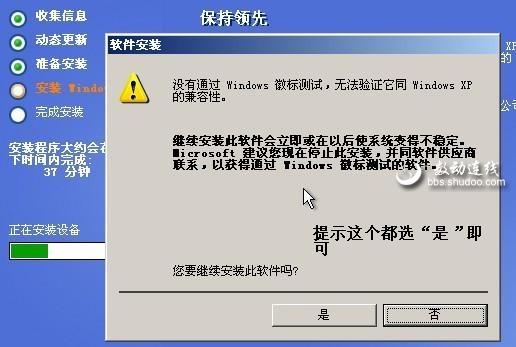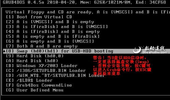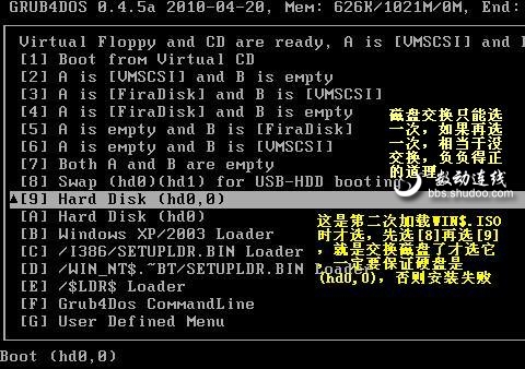 交换磁盘后,就是先选了[8]后,再从硬盘启动开始安装,选[9]Hard Disk (hd0,0), 硬盘启动,前提是你的硬盘是第一硬盘!!!!!然后就进入GUI安装界面了,会有些提示的,如驱动不是微软认证的,别理它,直接选择 "是 " 即可