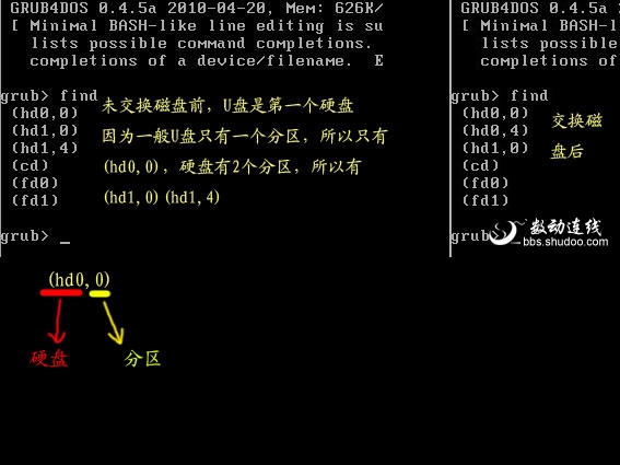 接着按 C 键,进入Grub命令行,用 find 命令查看你的硬盘是否为第一硬盘,如何查看呢?一般硬盘都会有几个分区,USB-HDD启动的话,未磁盘交换的话,一般是(hd1,0)(hd1,1)(hd1,2)……,U盘一般只有一个分区,所以是(hd0,0),(hd0,0)后面那只有0的话,那应该就是U盘了,(hd0,0)一定要对应你想要安装的硬盘,一定要看仔细!!如下图,硬盘有2个分区