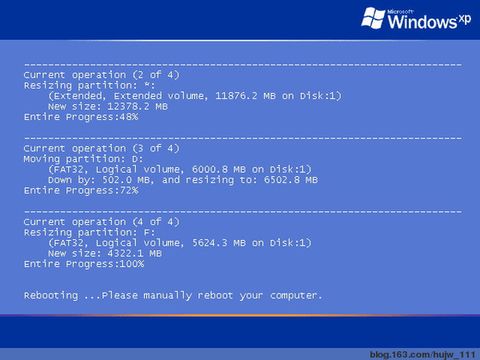 上图显示出调整分区空间前和调查分区空间后的对比图,确认正确后,点“完成”按钮关闭向导,否则点击“后退”按钮返回上一步再操作。点“完成”按钮后显示如下图所示。