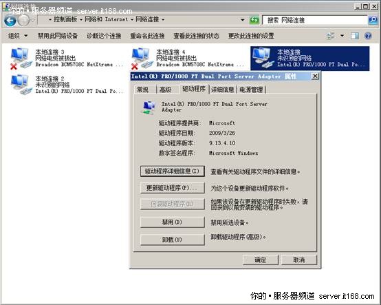 安装好操作系统,Windows Server 2008 R2此时已经识别出了两块网卡,但Windows自带驱动程序只更新到08年12月份。(图1)