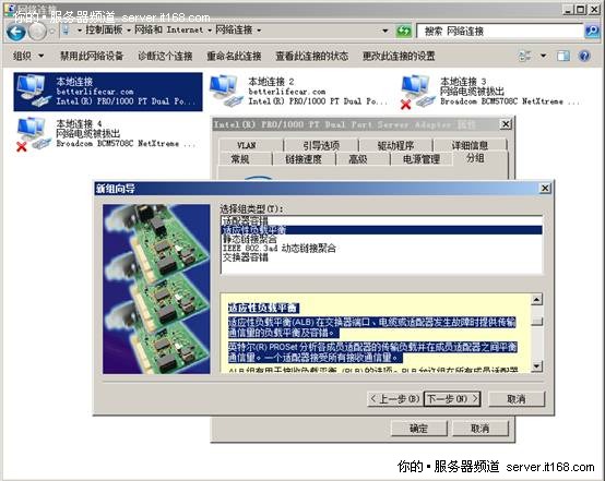 下一步就要选择网卡组的类型了,这里Intel一共支持5中类型的组模式,分别是:适配器容错、适应性负载均衡、静态链接聚合、IEEE802.3 ad动态链接聚合、交换机容错。其中适配器容错和交换机容错主要是为了防止硬件设备的单点故障。两种链接聚分别代表两种状态,旨在提高交换器之间或服务器和交换器之间的吞吐量。而我要使用的组模式为适应性负载均衡。关于适应性负载均衡的说明如下:
