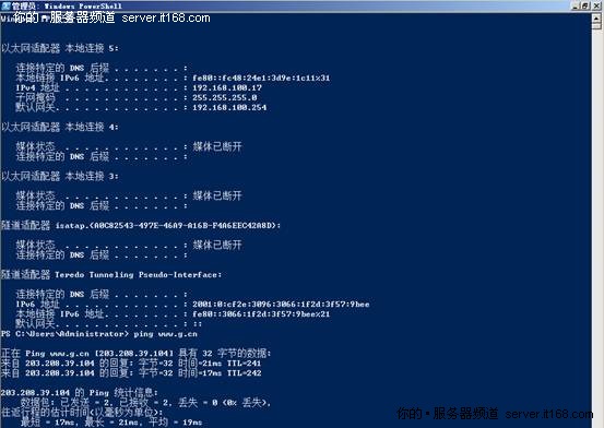 使用IPCONFIG命令查看一下,IP地址没有问题,与外网通信也正常。(图18)