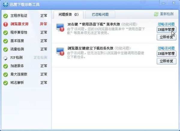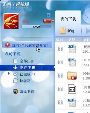 如图2所示,如果发现有问题,迅雷会在主界面上给出诸如“您有2个问题需要修复!”的提示(如图2),单击之即可修复。