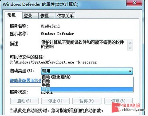 Win7的各种系统服务程序都集中在这里,我们可以选择对其关闭或者打开。在这里面找到“Windows Defender”,双击后会弹出一个对话框,点击“启动类型”,在下拉菜单里选择“禁用”,整个系统服务就被停止了。Windows Search和Volume Shadow Copy的禁用方法与此类似。