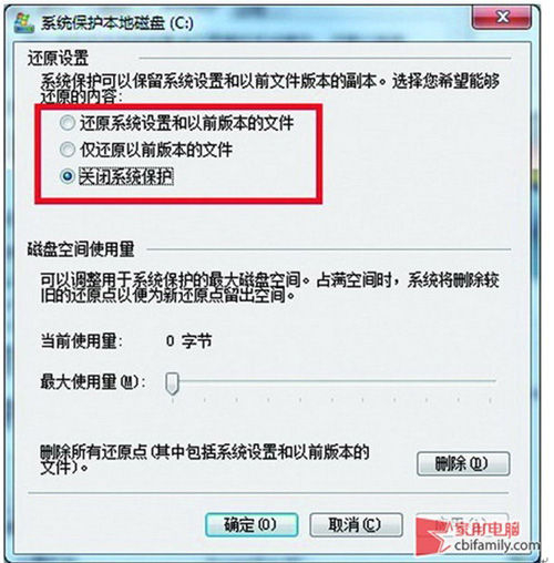 依次点击“计算机”“属性”“系统保护”,选择“配置”,在随后的界面中选择“关闭系统保护”。这里所谓的系统保护实际上就是Win7的自动备份功能,如果你不需要经常还原系统,完全可以关闭。