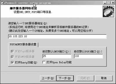 域名和管理员口令设置完成后,单击“下一步”按钮进入“网络设置”窗口。在这里可以设定DNS地址、SMTP端口、POP3端口等信息。DNS地址栏中应该填入当地电信部门或您所在的ISP提供的DNS地址,当然如果您只是在局域网内部通信且使用机器名作为域名,则只需填入服务器IP地址即可。本例中的DNS地址为本机IP地址“10.115.223.10”。SMTP端口和POP3端口应该采用默认参数,不过在这里可能会遇到SMTP端口或POP3端口被占用的问题。我们应按照提示停止某些程序对该端口的占用,并且保证以后在运行FMS时这些应用程序始终被关闭。该窗口最下边有一个关于Esmtp的可选项,这是一种身份认证功能,与客户端的“SMTP服务器需要身份认证”配合使用,可以杜绝垃圾邮件的侵袭(图2)。