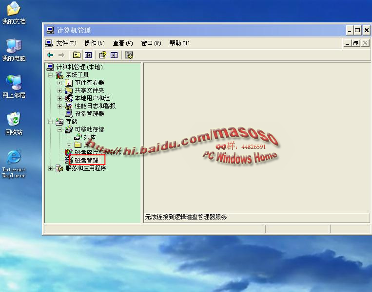 4.磁盘管理。显示为一片空白,显示无法连接到裸机磁盘管理器服务,但是“我的电脑”内却可以看见磁盘分区。