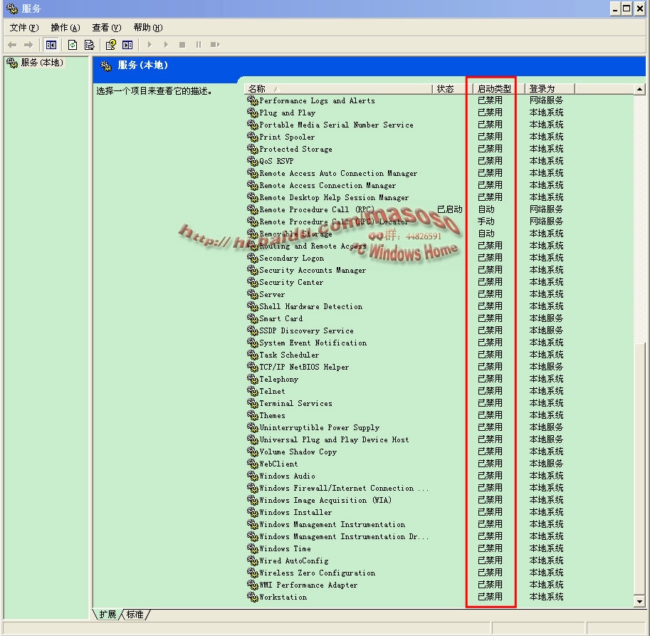 2.服务和应用程序,只有3个显示为“已启动”,其余全部显示“已禁用”,包括“Plug and Play”。