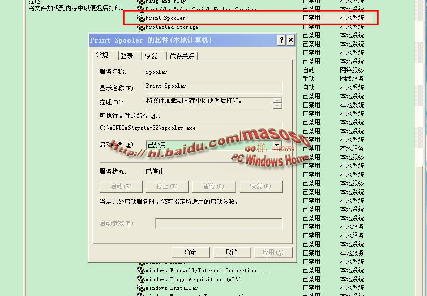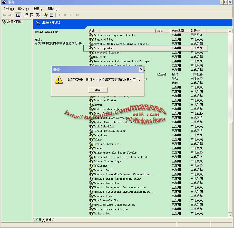 第一条,略过,经过实验,所有已被禁用的服务都无法启用,我截了张启用打印机的图,与启动Plug and Play 服务是一样的,: