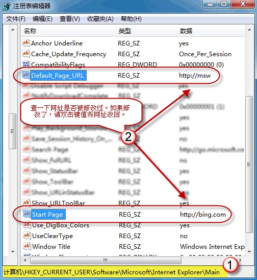 类似地,请依次定位到以下3个注册表项。单击Main,查看右边细节窗口中[Default_Page_URL]值和[Start Page]值是否有异常。如果被修改了,请根据自己的需要改回(右击键值,选择“修改”进行更改)。