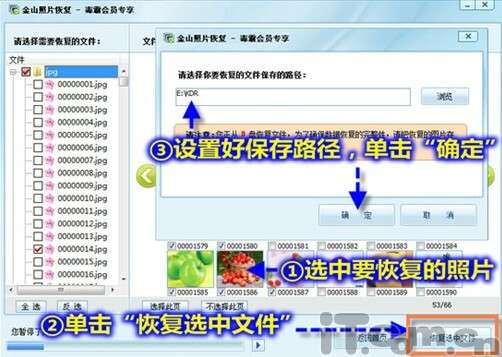 第三步:恢复误删除的照片。找到可以恢复的照片,以缩略图形式在窗口中列出,选中要恢复的照片,单击"恢复选中文件"按钮,在弹出窗口中设置好恢复文件的保存路径,最后单击"确定"按钮(如图3),即可恢复误删除的照片。