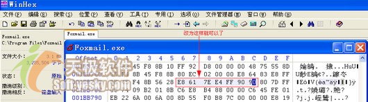 我们可以想办法DIY一个新Foxmail,它对任何口令都具有“免疫力”——无论你输入任何密码都可以进入自己的账户中。请大家下载工具软件WinHex,运行该软件用它打开Foxamil安装目录下的foxmail.exe文件,同时按下Ctrl+Alt+F打开“查找16进制数值”对话框(图1),在这里输入E8617EE4FF7515,单击“确定”开始查找,找到后把其中的7515改为9090,其他代码不用改(图2),然后保存就可以了。该技巧对最新的Foxmail5.0.500.0版有效。对于早些的Foxmail5.0.290.0可以查找E82978E4FF7515,找到后同样把改为7515改为9090,其他代码不用改,保存后就可以无需口令进入加有口令的账户。(点这里下载WinHex汉化版)
