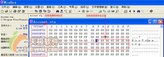 Foxmail的账户口令保存在该账户对应文件夹下的Account.stg文件中,用16进制工具软件WinHex或UltraEdit打开它,看Offset那一列,那是文件的偏移地址,从00000F89到00000FAF中的数据就是经过加密的账户口令,如图所示(图4),把它们都改为“00”(没有引号),然后保存就可以清空账户口令,接下来就能随意查看自己的邮件了。