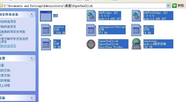 再说正事。和大多数人一样,我拿到飞机后就想到用一键ROOT工具软件,以为安装一下就能获得超级用户权限,但没有那么容易的事。只好按部就班的来。下面我们来看看ROOT方法,其实也非常简单。下载必要的工具软件SuperOneClick,在电脑上解压后一般是一个文件夹,里面有很多文件,我们使用的是两个文件,一个是SuperOneClick,电脑上用的,绿色软件;另一个是手机端的安装软件,大家看到那个SUPERUSER.APK文件就是,记得安装后不要打开它,放那儿就行了。