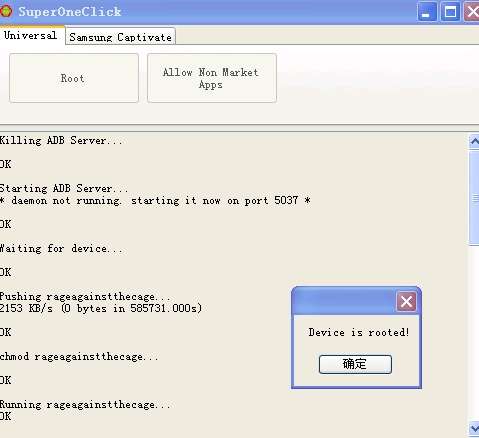 确认手机连接正常后,点击它一下,会弹出一通鸟文,你懂的。里面都是OK就说明ROOT正常。最后会弹出不念旧恶小的对话框,里面是“Devise is rooted”,下面是OK,我们点击OK就真的OK了,宣告ROOT成功。不放心就继续来第二遍同样操作,结果是一样的。不过我是一次成功。后来为了截图,重新再ROOT了一次。