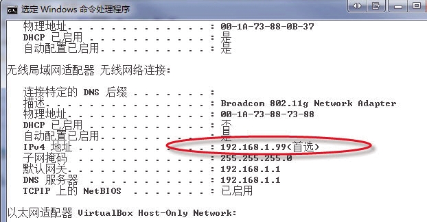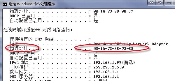 重启之后,同样打开开始菜单→所有程序→附件→命令提示符,然后输入命令ipconfig /all,在这里检查一下MAC地址是否已经修改为老笔记本无线网卡的MAC地址。如果修改成功,就可以正常上网了。如果网络IP地址不是自动分配的,那么还需要在适配器选项中输入第二步获取的IP参数。
