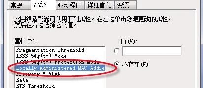 进入属性界面的“高级”选项卡,找到Locally administered MAC address,如果不是这个选项也没关系,看到有MAC字样的选项就可以点进去看看,如果看到界面如图,就是这里了。如果这个界面是中文界面,那选项可能是“网络地址”或者类似的字符。