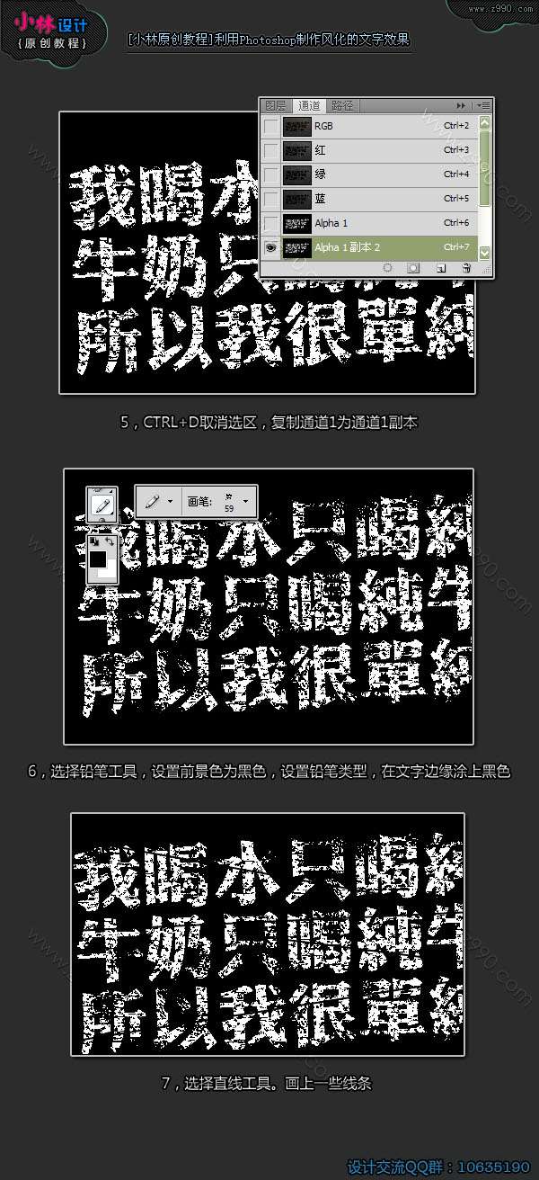 6,选择铅笔工具,设置前景色为黑色,设置铅笔类型,在文字边缘涂上黑色;
